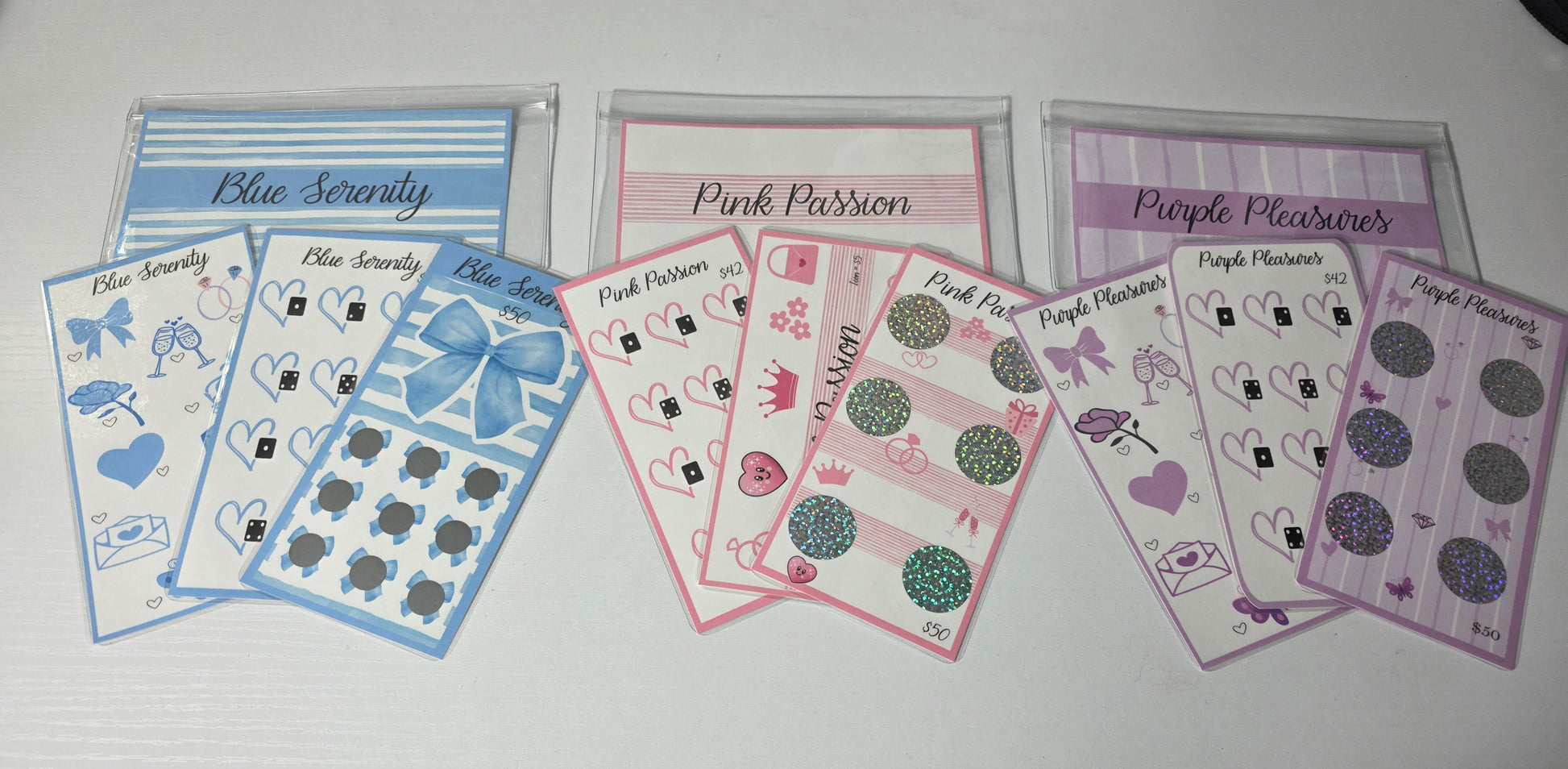 This is a total of 9 laminated challenges that include 3 scratch and saves, 3 roll and saves and 3 color and saves. You also get 3 double pocket clear envelopes with 3 matching dashboards!